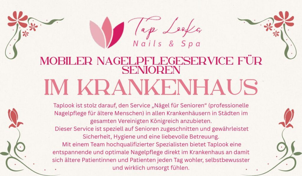 TapLook Nails & Spa bringt personalisierte Nagelpflege direkt an das Krankenbett der Patient:innen und bietet Maniküre, Pediküre und spezialisierte Nagelbehandlungen an. Unser Team widmet sich sanften, entspannenden Behandlungen in großen Krankenhäusern in Wiesbaden, darunter Helios HSK Dr. Horst Schmidt Kliniken Wiesbaden, Klinik Aukamm Wiesbaden, Klinik Maingau Wiesbaden, Deutsche Klinik für Diagnostik Wiesbaden, St. Josefs-Hospital Wiesbaden, Klinik Dr. Reis Wiesbaden, Klinik im Park Wiesbaden, DKD Helios Klinik Wiesbaden, Horst-Schmidt-Kliniken Zentrum für Innere Medizin, Klinikum Wiesbaden Zentrum für Orthopädie.
